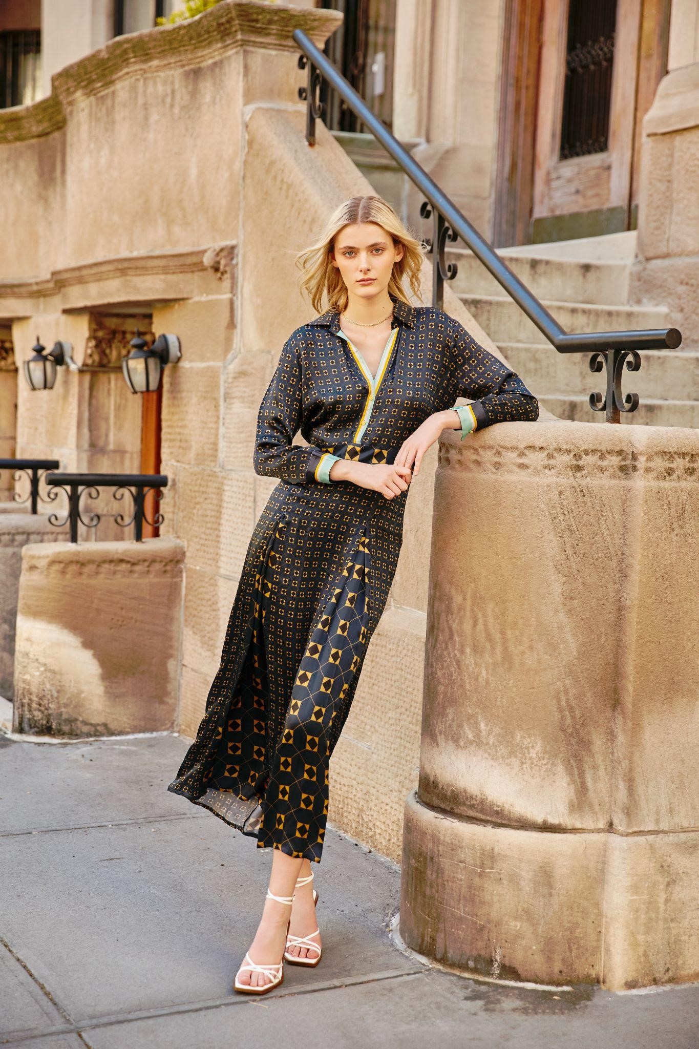 The unilluminated Hazel wrap dress in twill silk by Falguni Shane Peacock is capacious and gives a good first impression. A subtle choice for a business meeting that will make you look undaunted and confident.