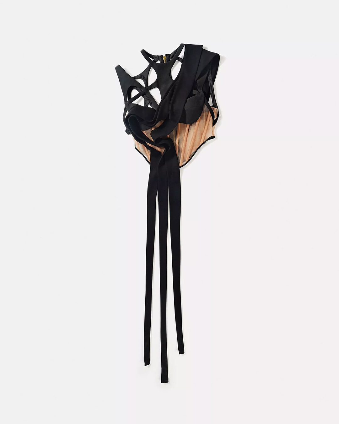 A sheer based, black cut-out corset top, with fabric drapes running across the shoulder to the back and dangling scuba georgette patches. The stylish top for women is finished with FSP monogrammed golden zipper at the back.