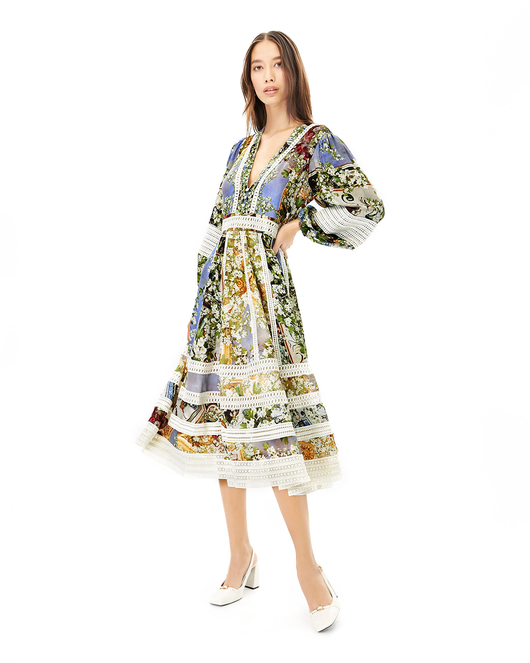 The Art Deco Lace midi dress is a multicoloured tiered dress by Falguni Shane Peacock. The casual dress is tailored from 100% linen and features a V-neckline, lace detailing, a pleated skirt and bishop sleeves.