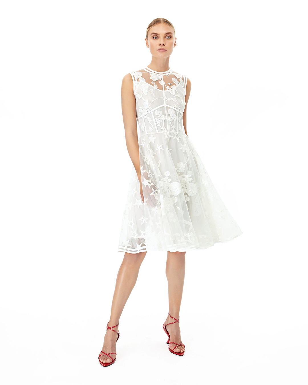 WHITE CHANTILLY EMBROIDERED SLEEVELESS DRESS