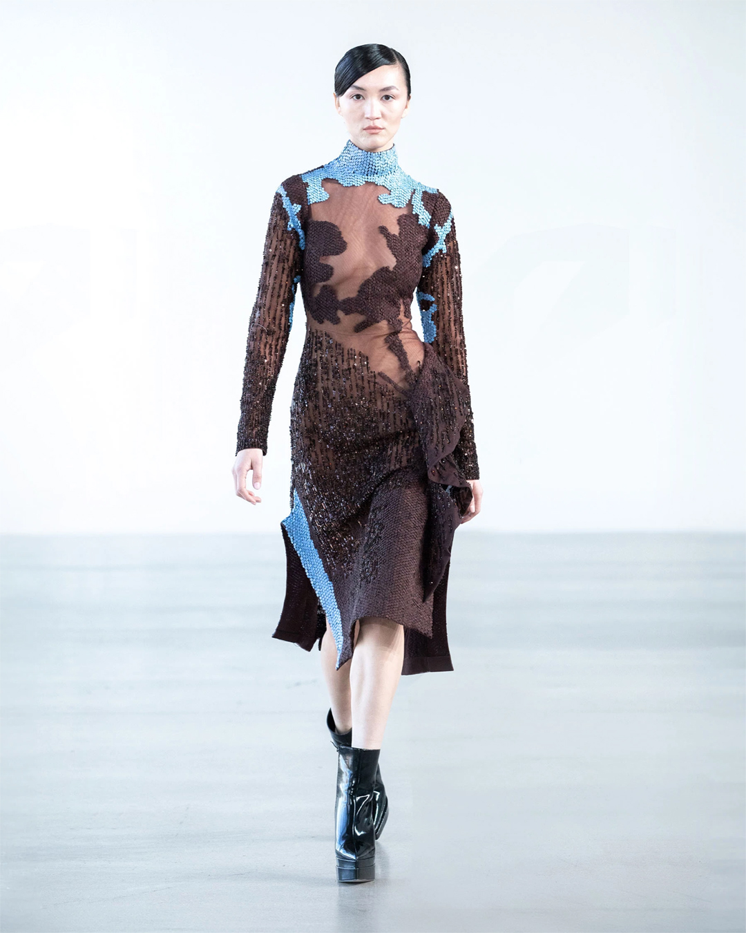 A chestnut brown, sheer, long dress embroidered with crystal blue and brown silk buttons.