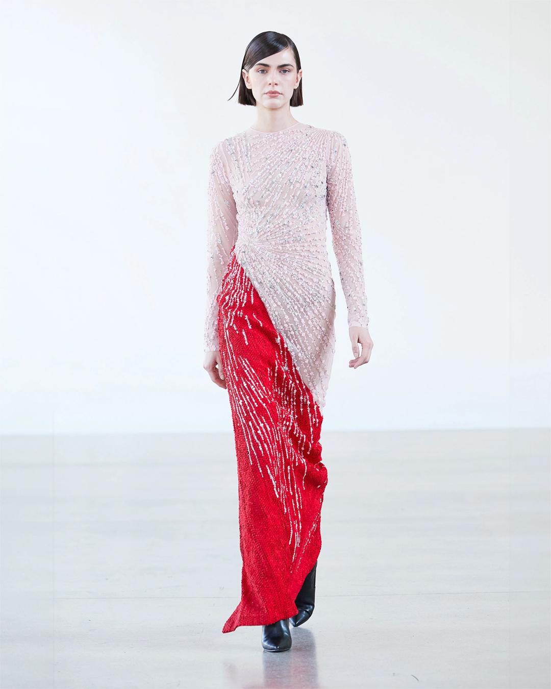A sheer-based, rose quartz pink and scarlet red long dress has silver sequins, crystals, and silk buttons.