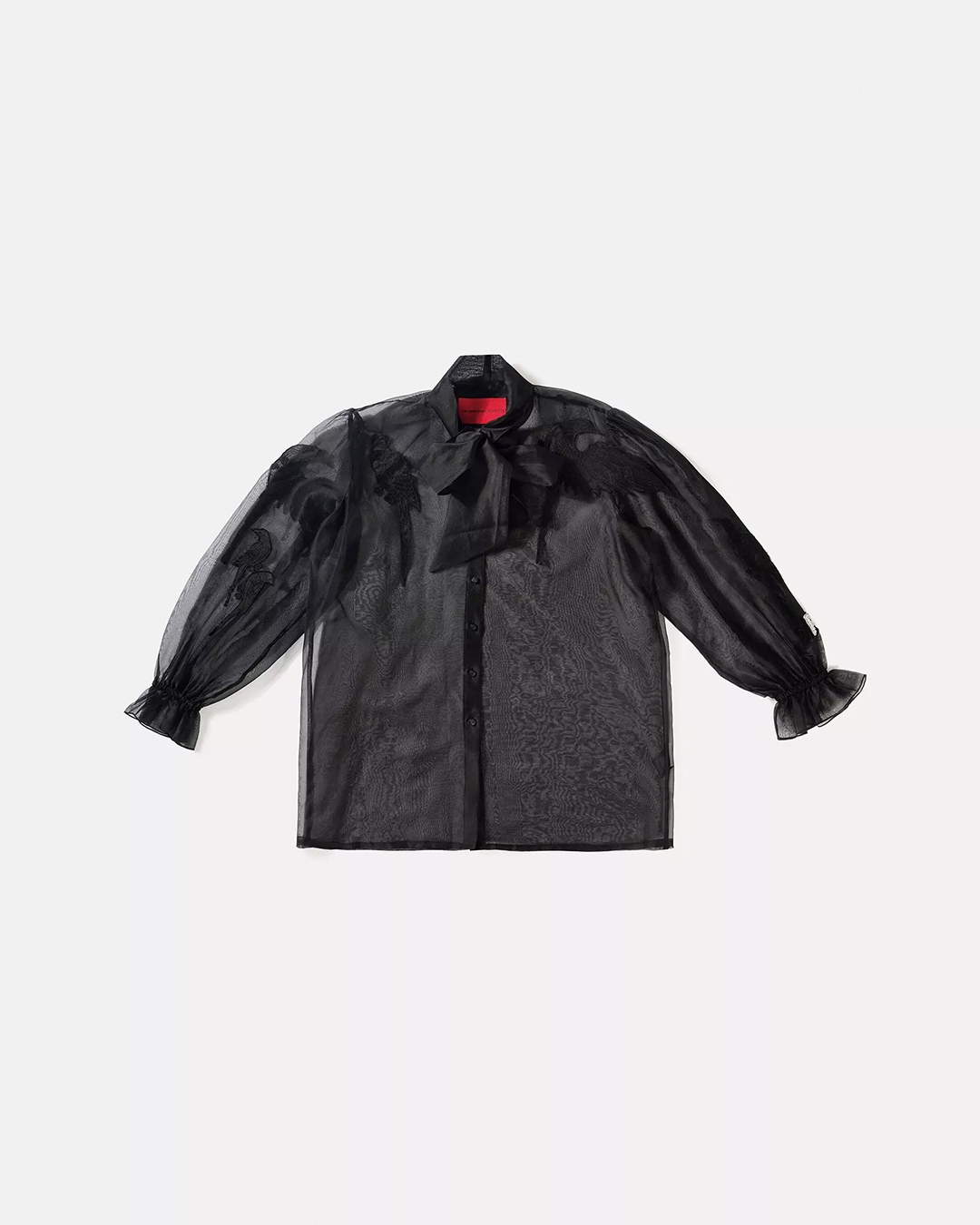 Black sheer organza shirt featuring embroidered bird motifs and a necktie. The shirt has a button-down centre, bishop sleeves and an FSP monogram embellished around the wrist.