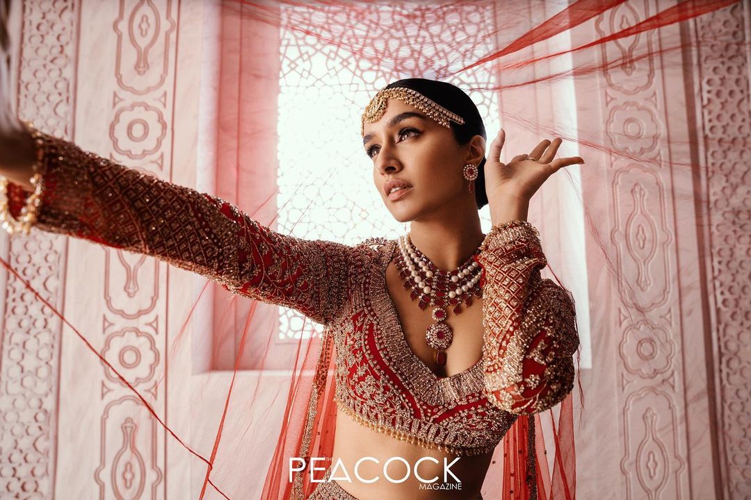 The crimson-based, multicolored Falguni Shane Peacock Lehenga is adorned with elaborate arch and architectural motifs. The Indian Lehenga also features floral motifs decorated with stones, crystals, and beads. The Lehenga is teamed with a full-sleeved, cropped corset blouse, a veil with an ornate border, a tulle Dupatta featuring Butti motifs, secured by an embellished belt. The collection included similar other styles in royal red bridal Lehengas.