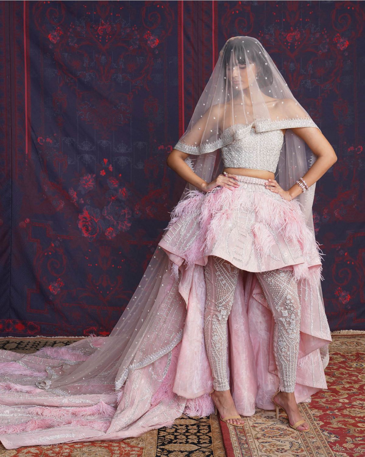 The rage of asymmetrical Lehengas gripped recently. Brides wanting to create an off-beat and unconventional sangeet or cocktail can pick an edgy, asymmetrical Lehenga. The Falguni Shane Peacock bridal Lehenga is an asymmetrical layered number with feather details. Teamed with an off-shoulder blouse, it makes quite a suave pick for the modern bride.