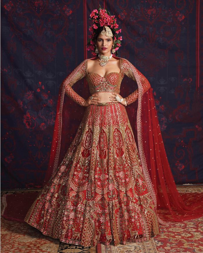 Lehengas with a trail add an opulent characteristic to your bridal persona. Trails became a sought-after feature in ball gowns. The inspo is tactfully integrated in an Indian Lehenga to create a sophisticated and refined bridal look. If you envision an ethereal walk down the aisle with a foot-long trail glissading behind you, opt for a trail Lehenga like this Falguni Shane Peacock number.