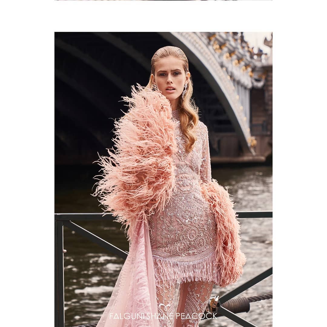 The peach pink, intricately embellished, asymmetrical kurta with an extended trail is teamed with a pair of sheer embellished pants and a feathered shrug.