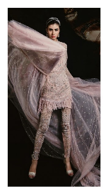 The rose quartz hued, intricately embellished, asymmetrical kurta with an extended trail, teamed with sheer pants infuses a bold statement in the ethnic look.