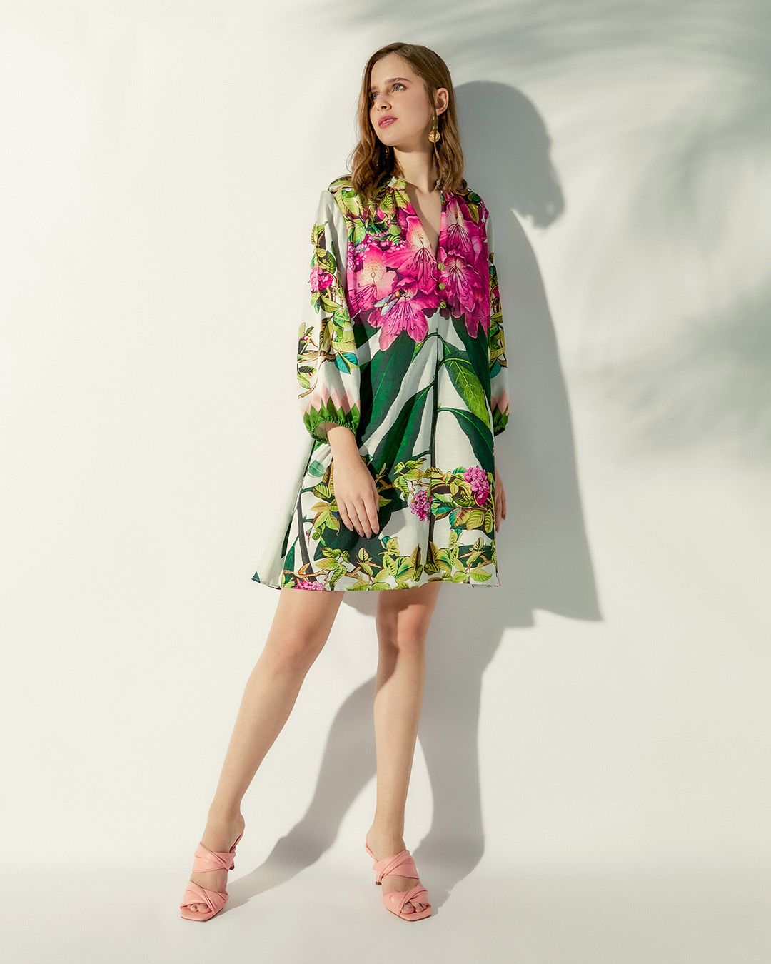 Mystic Wilderness stylish short dress features a V-neck with buttons down the centre front.