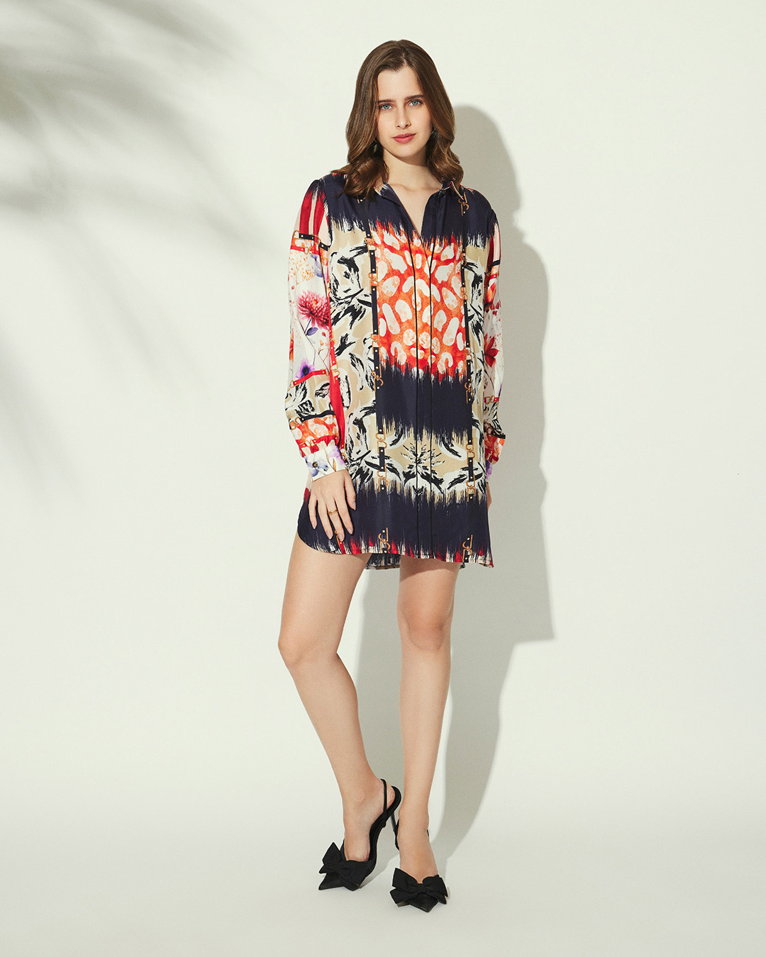The Tangerine Bloom short dress is made from 100% silk and features a relaxed fit, long sleeves and customised FSP buttons.