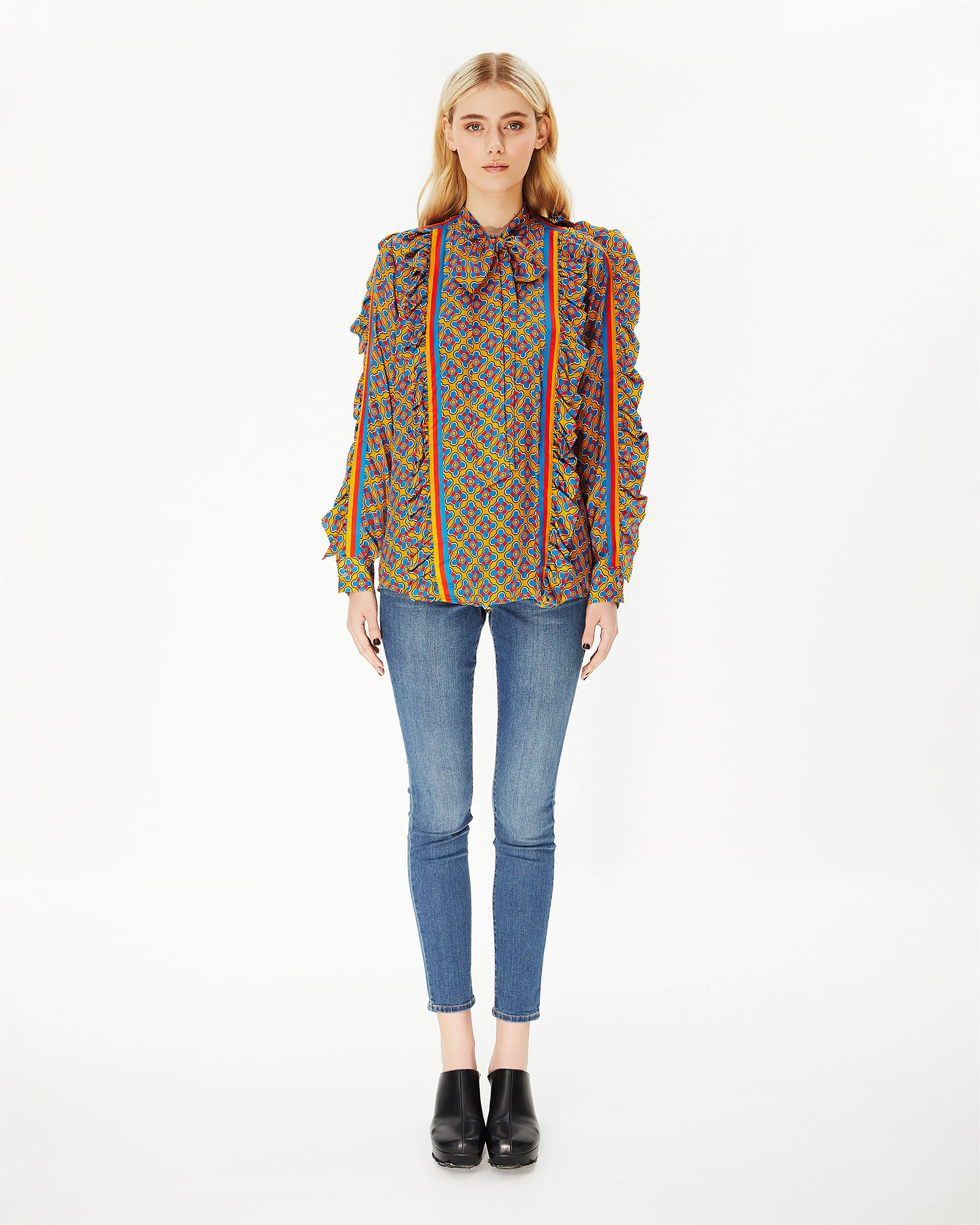 This multicoloured women’s blouse is the perfect one if you want to add some colour to your fashion wardrobe. The twill silk relaxed fit printed blouse design features a high mandarin collar, long sleeves, gathered drawstring detailing in the front and FSP buttons.